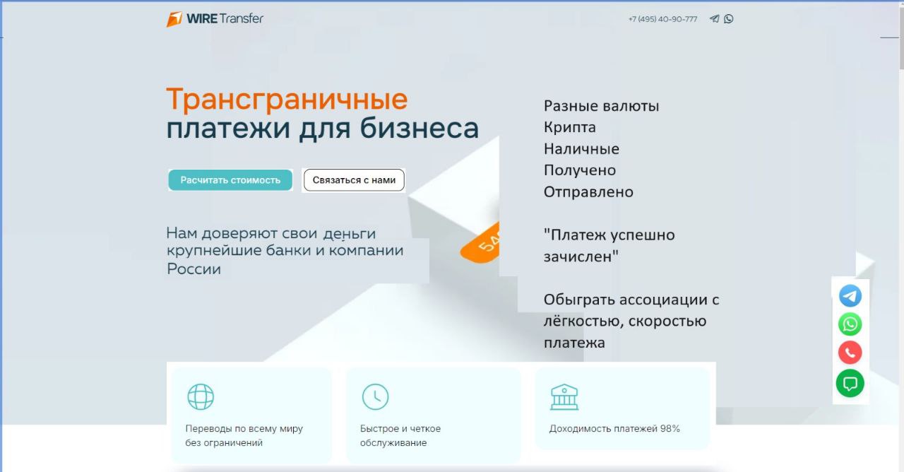 Начать сотрудничество, получить консультацию по вопросам трансграничных платежей, вы можете по телефону WIRE Transfer или через форму обратной связи, наши менеджеры свяжутся с вами с ближайшее время.